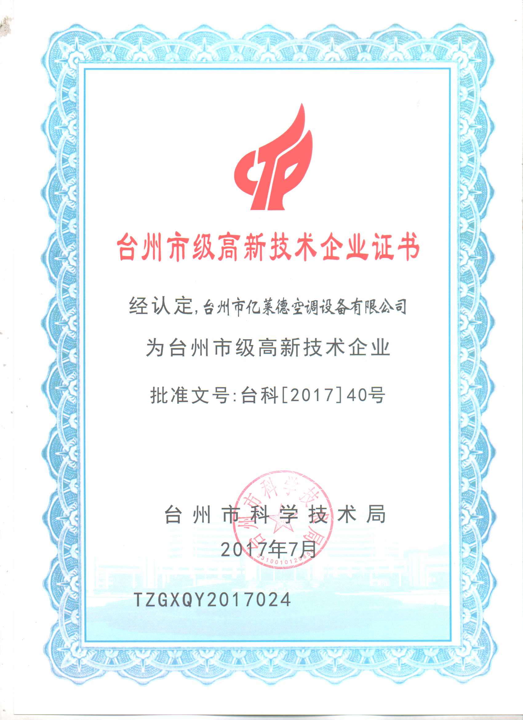 臺(tái)州市級(jí)高新技術(shù)企業(yè)證書
