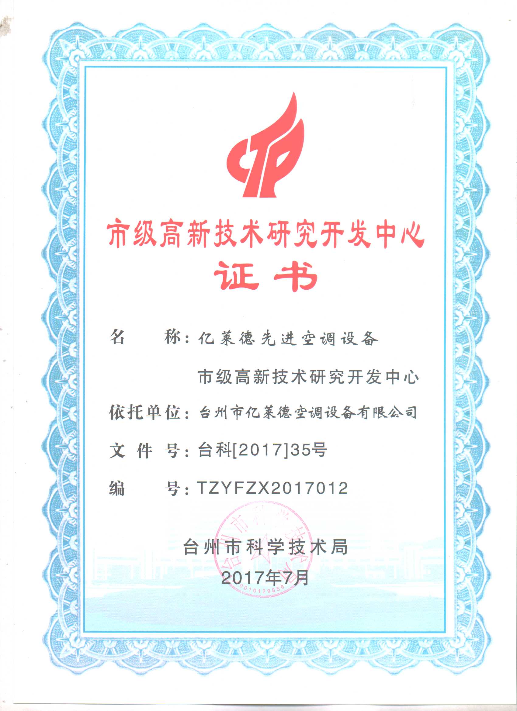 市級(jí)高新技術(shù)研究開發(fā)中心證書