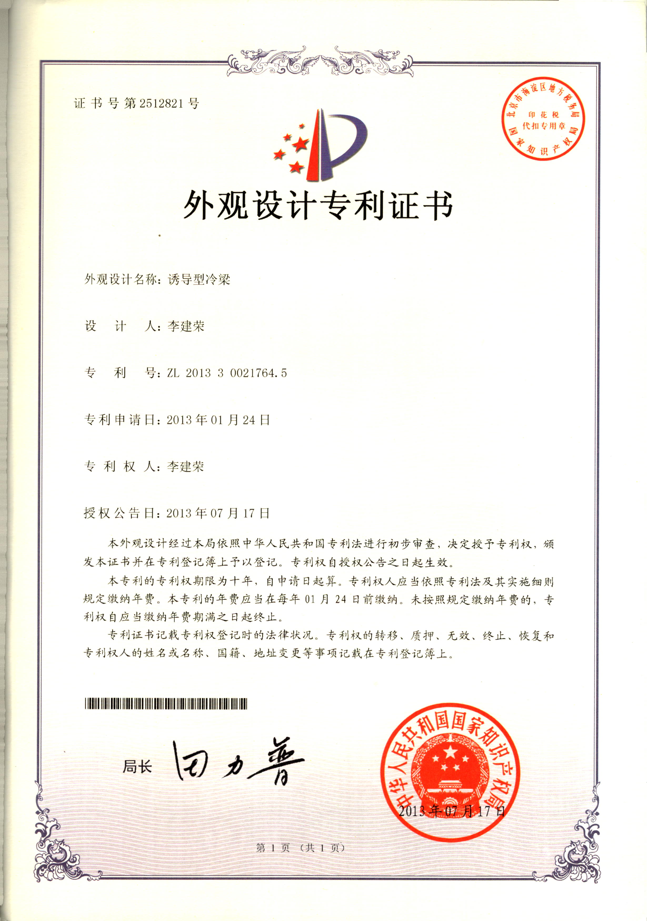 外觀設(shè)計(jì)專利證書--誘導(dǎo)性冷梁