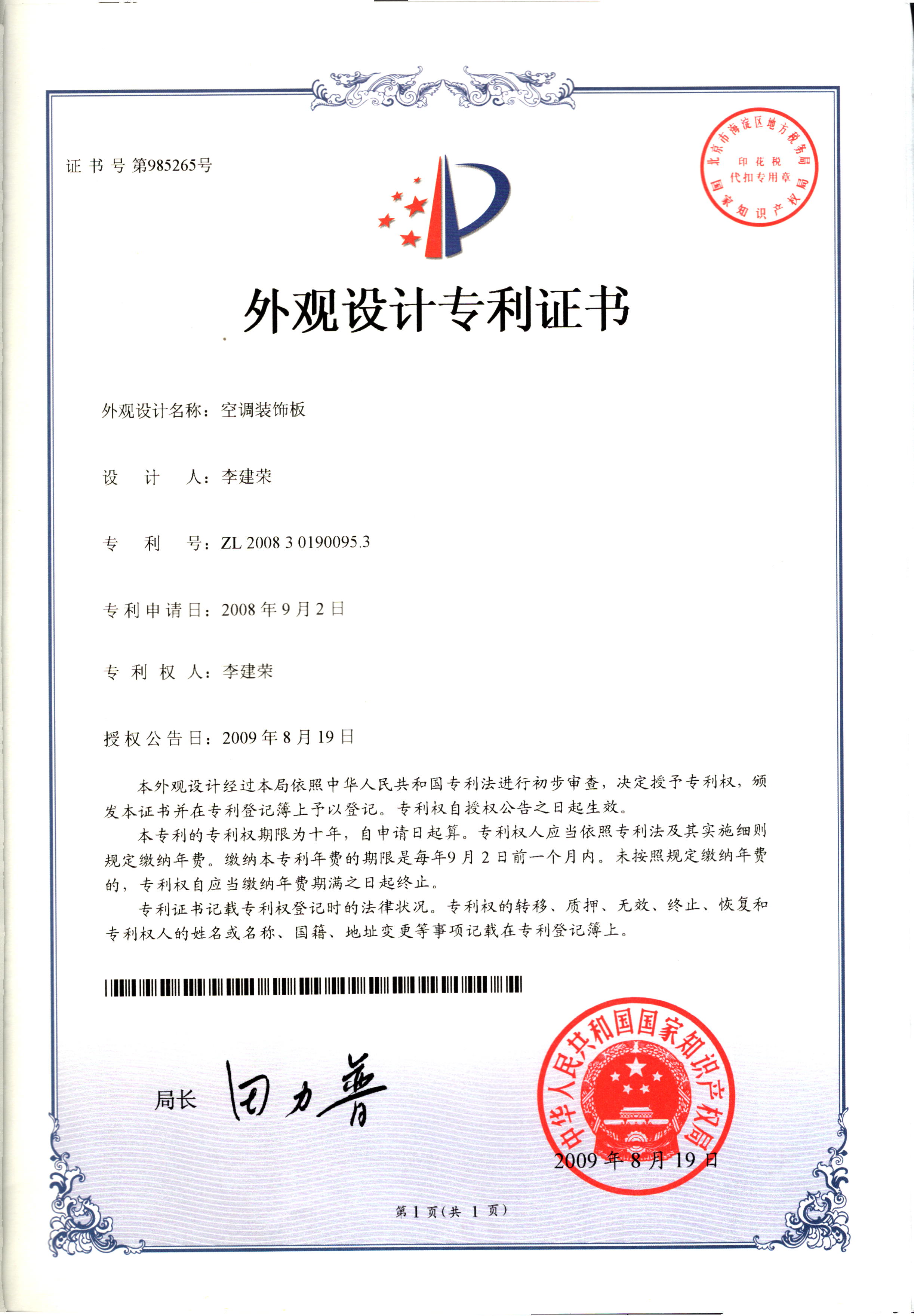 外觀設(shè)計(jì)專利證書--空調(diào)裝飾板