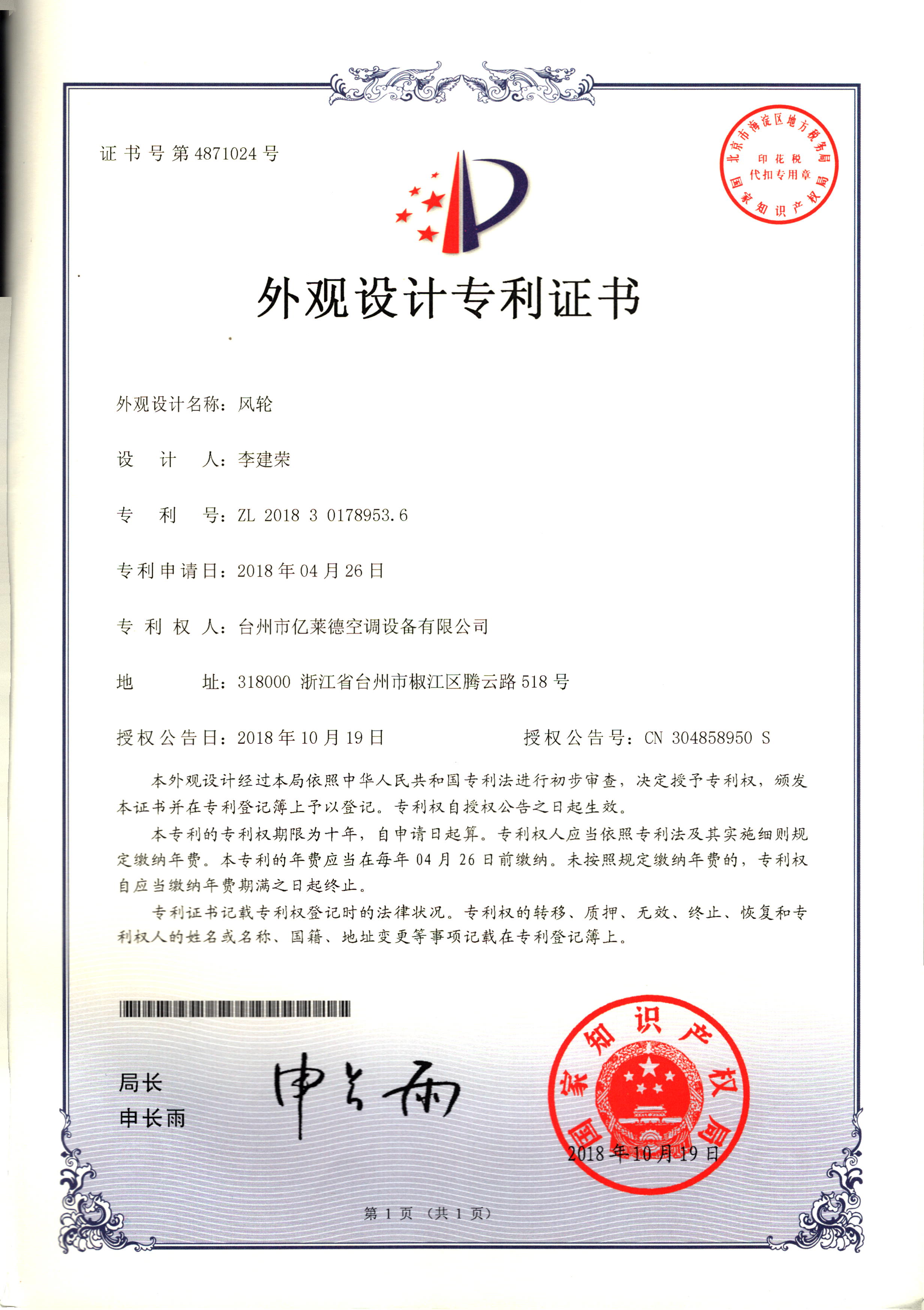 外觀設(shè)計(jì)專利證書--風(fēng)輪