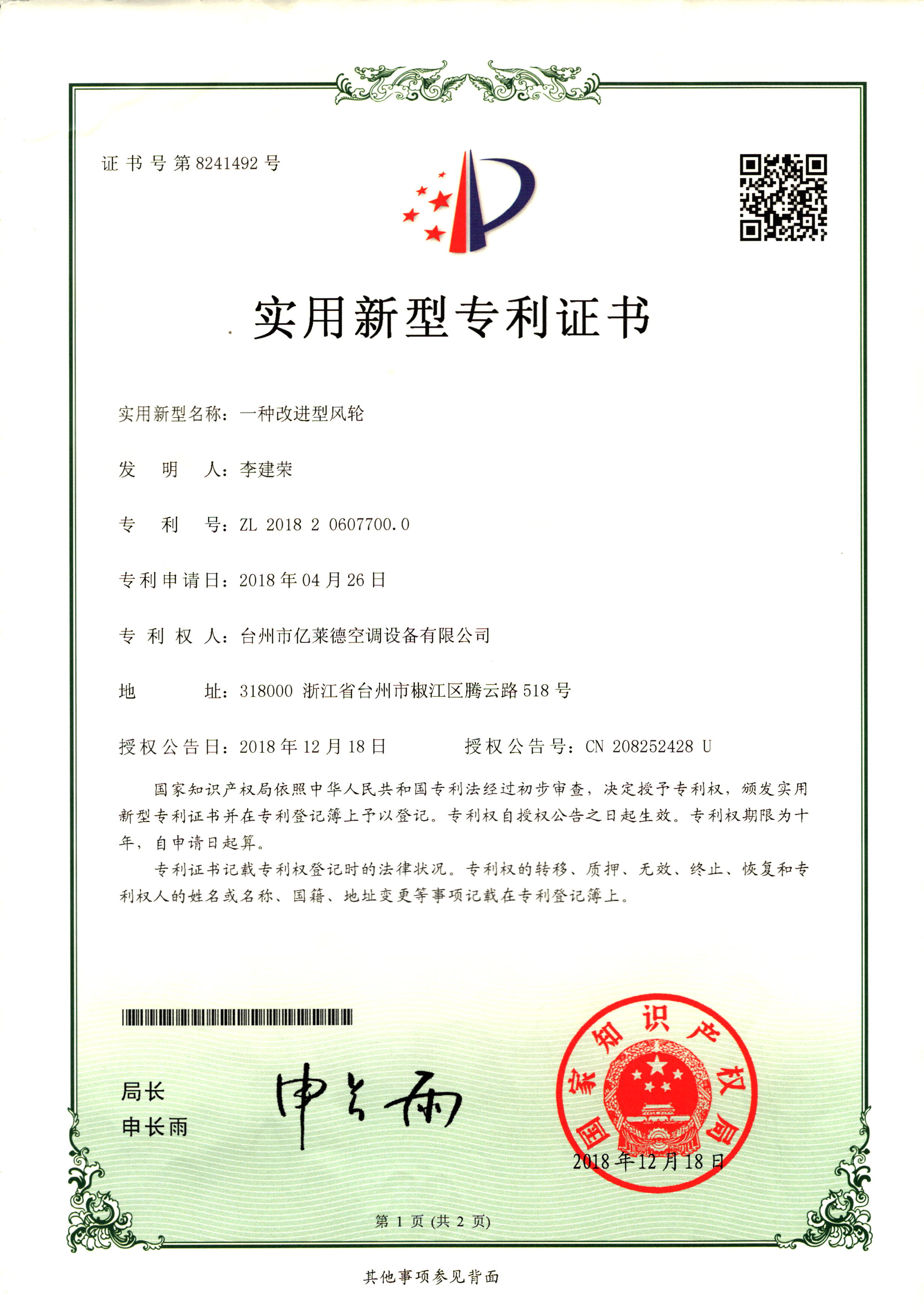 實(shí)用新型專利證書--一種改進(jìn)型風(fēng)...