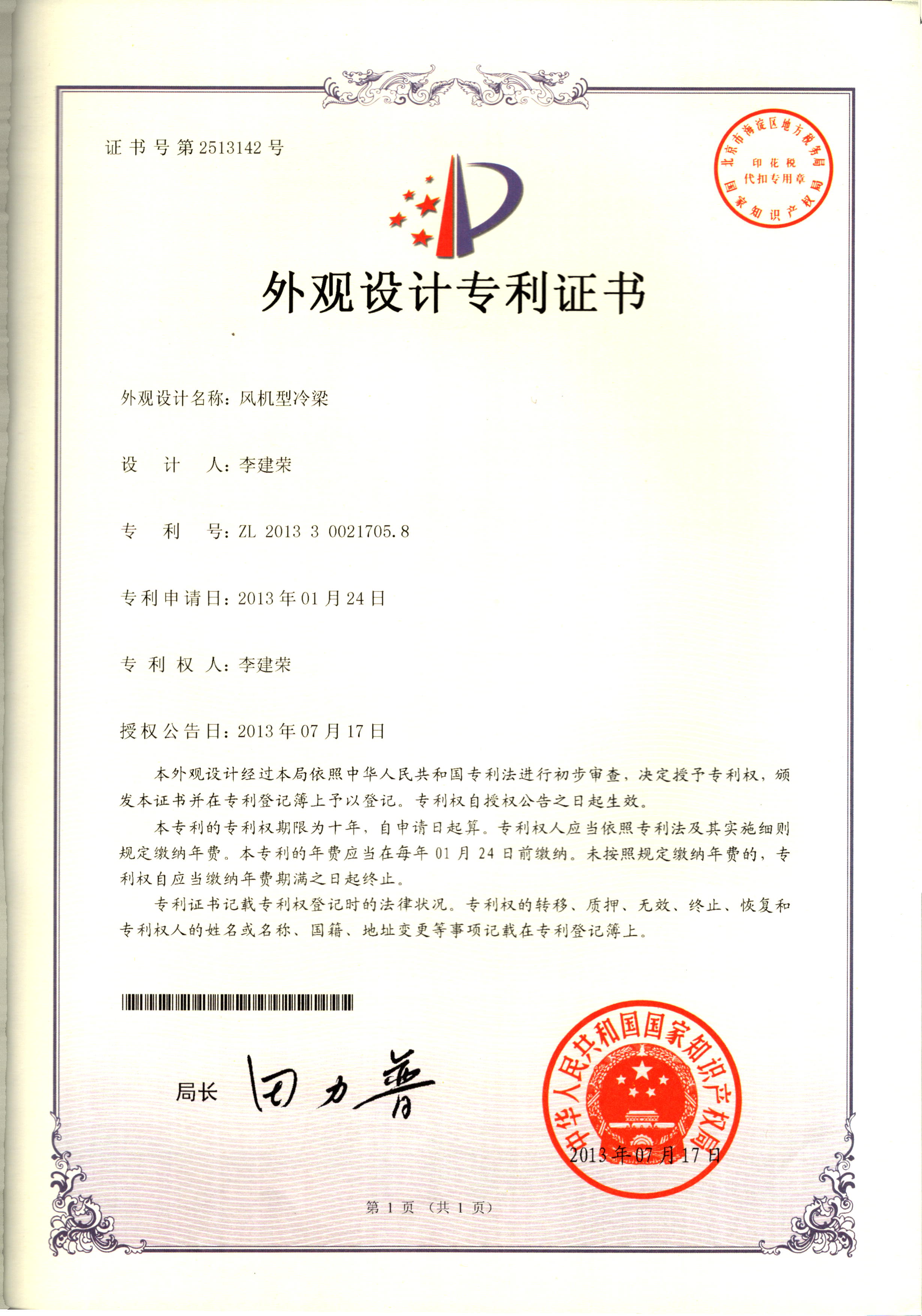 外觀設(shè)計(jì)專利證書--風(fēng)機(jī)型冷梁