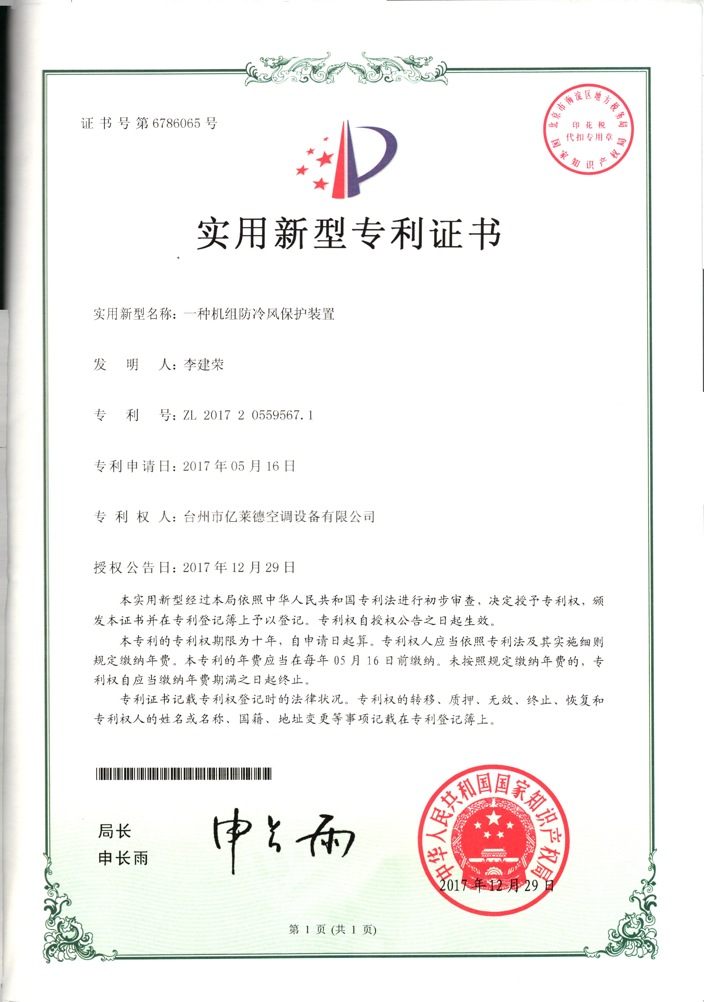 實(shí)用型專利證書--一種機(jī)組防冷風(fēng)...