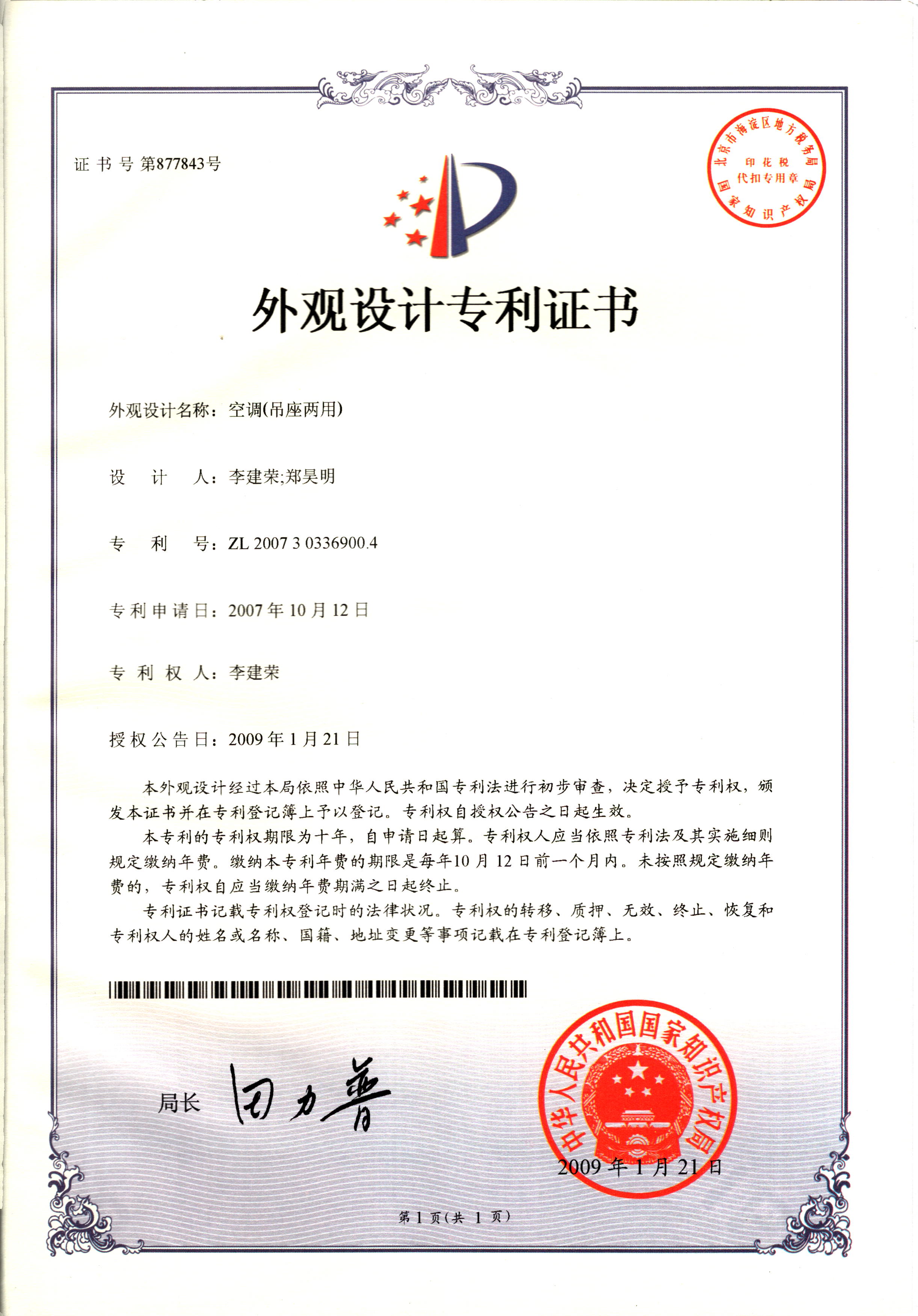 外觀設(shè)計(jì)專利證書--空調(diào)(吊座兩用...
